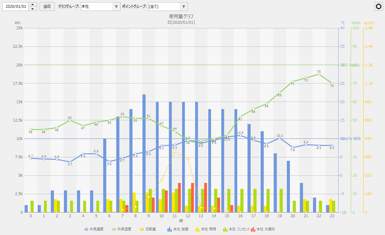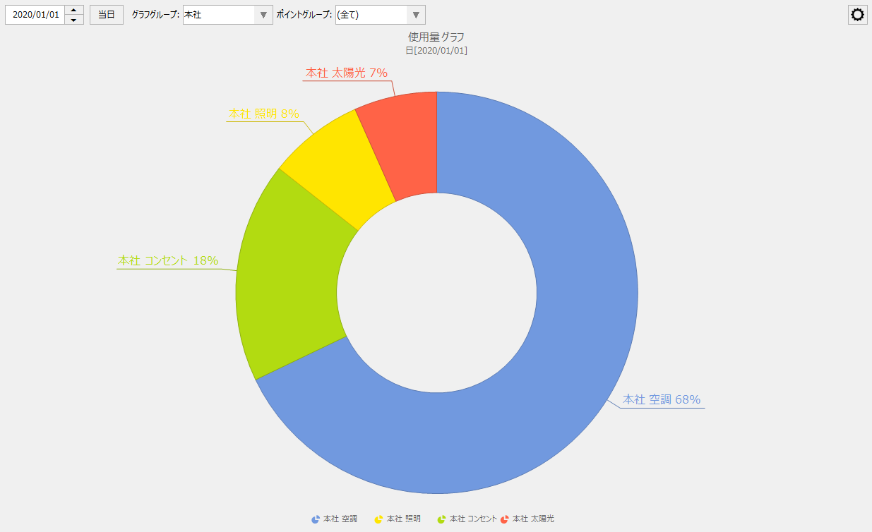 エネルギー管理グラフに表示する対象日付を選択します。「当日」ボタンをクリックすると当日の日付を指定することができます。 |