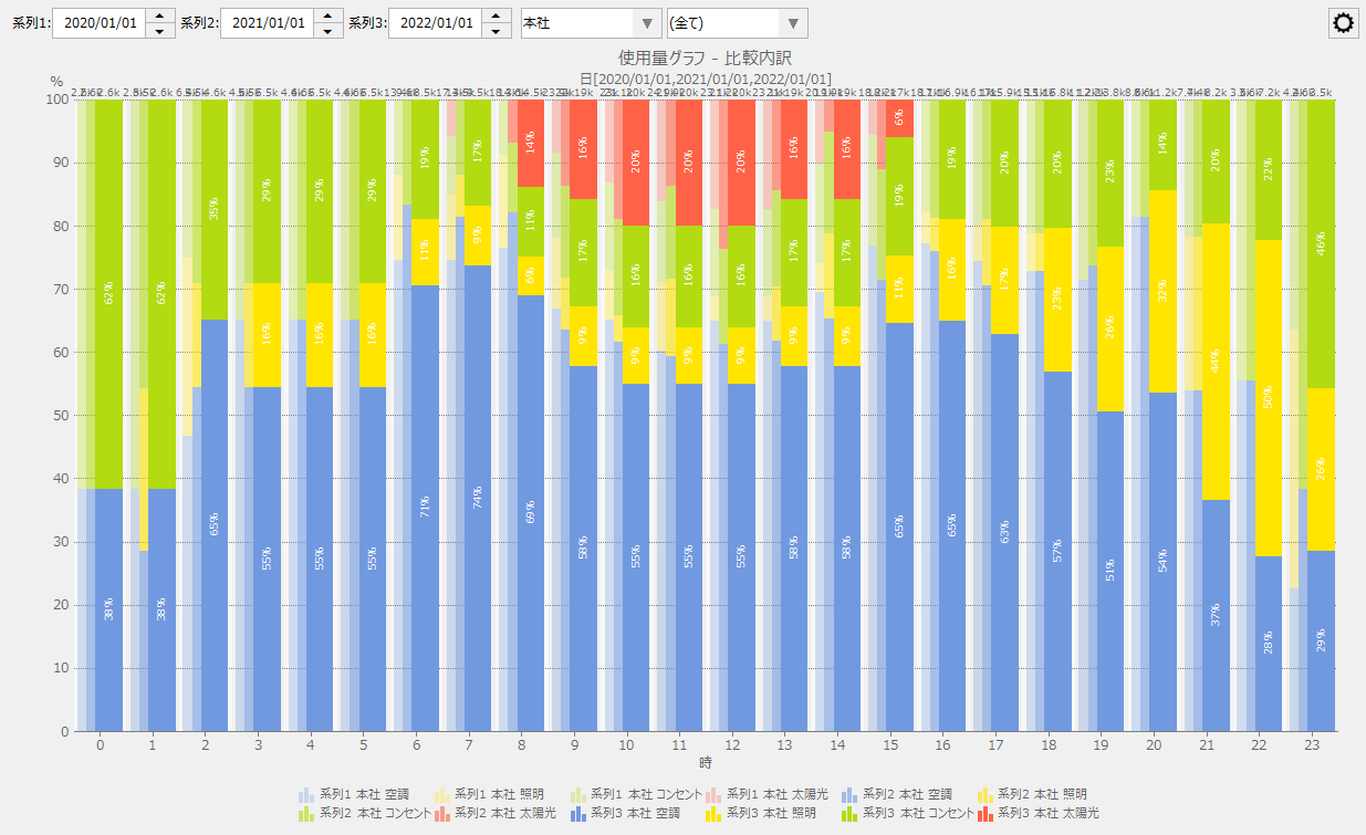 以下は、使用量グラフの表示方法を「100%積層」とし、比較表示モードで表示した例です。時系列毎の合計値を100%積層棒グラフで表示します。