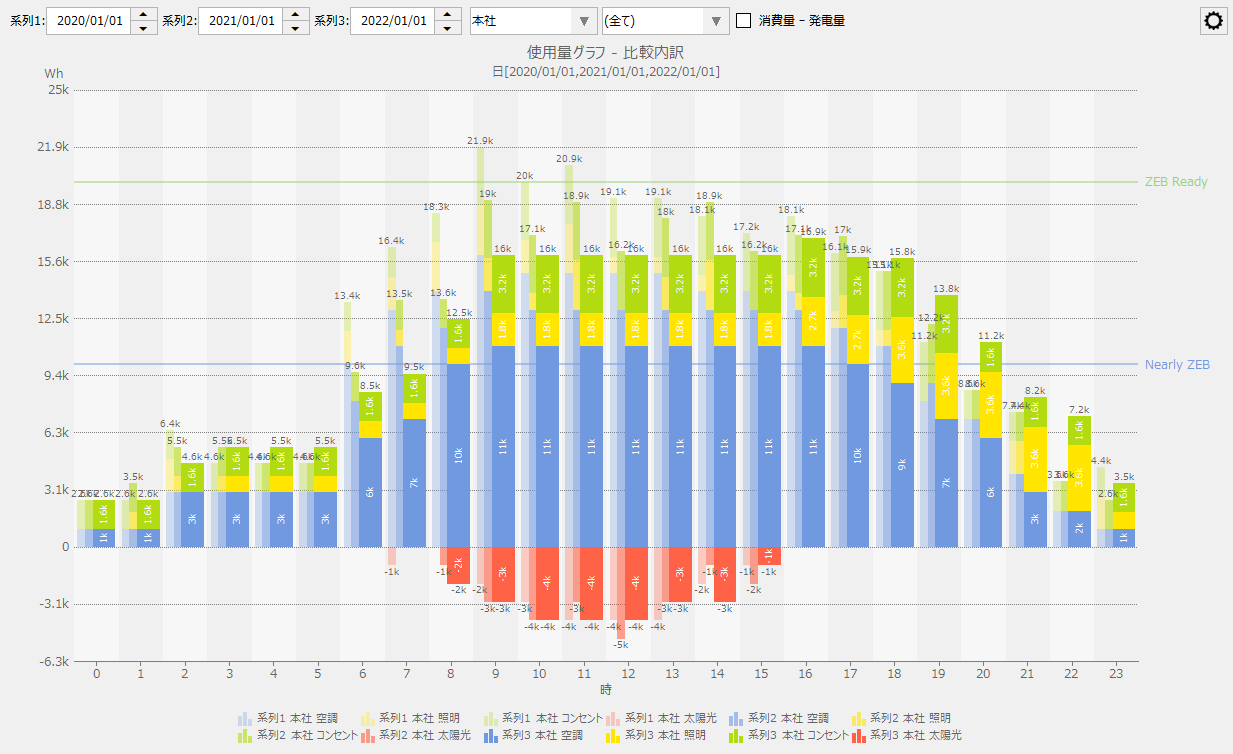 以下は、使用量グラフの比較内訳表示モードで、表示方法を「発電・消費量」とした例です。選択されたグラフグループの内訳のうち、発電量(創エネルギー)をマイナス方向で表示します。