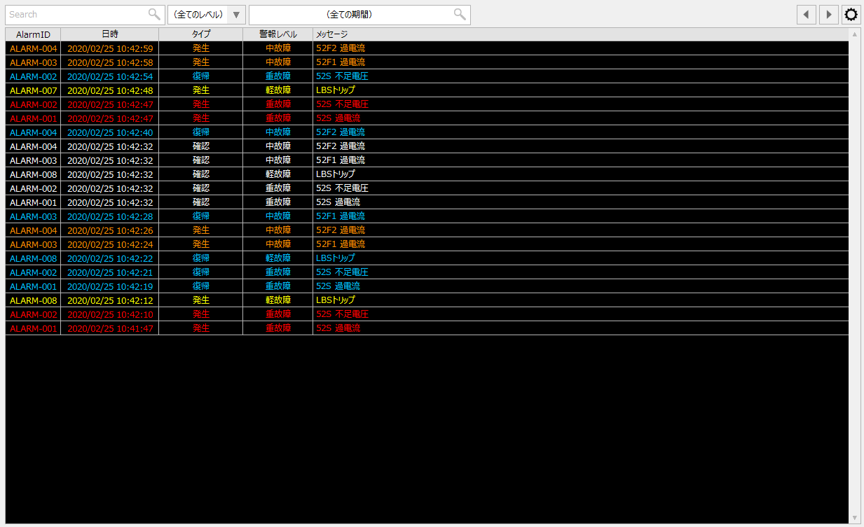 アラーム履歴画面ライブラリでは、指定した期間のアラーム履歴を表示します。表示中はリアルタイム更新はせず、表示後に発生した新しいアラームは画面を再表示するか、再検索して表示します。 |