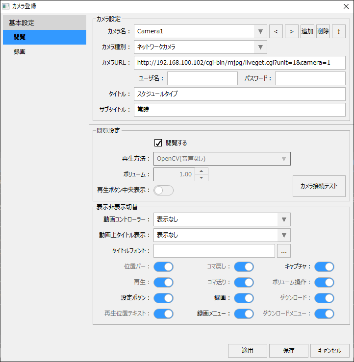 カメラ登録画面ライブラリは、ビデオプレイヤーやビデオレコーダーで使用するカメラ情報を登録するための設定画面が画面ライブラリ化されたものです。 |