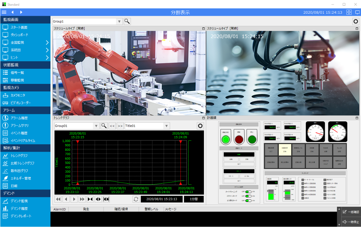分割表示画面ライブラリは、複数のグラフィック画面やライブラリの画面を並べて同時に表示する用途ほか、ネットワークカメラなどの映像を並べて表示する「カメラモニタ」として使うことができます。カメラモニタとして使用するための具体的な設定方法については、監視システム構築ガイドの「分割表示(カメラモニタ)」を参照してください。