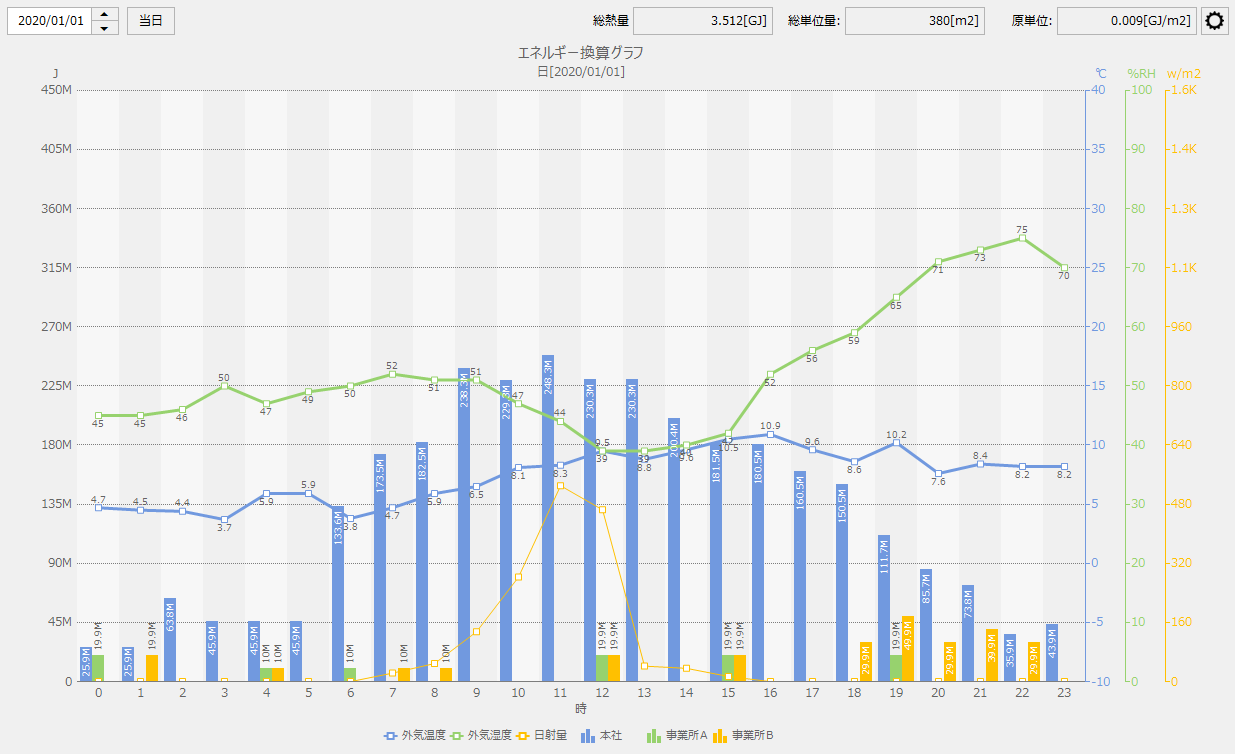 各種使用量を熱量(J(ジュール))に換算してグラフ表示します。 |