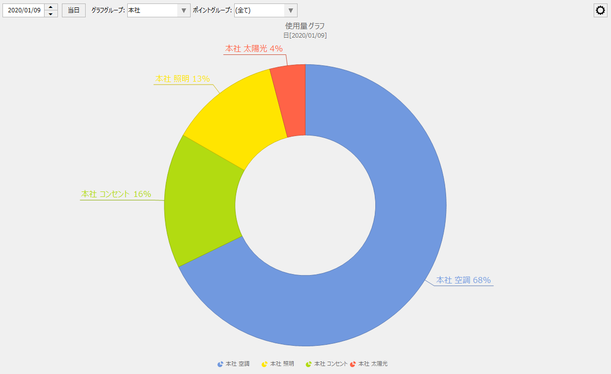 グループ設定に基づいた集計単位毎に表示期間の小計を求め、合計を100%とした円グラフで表示します。