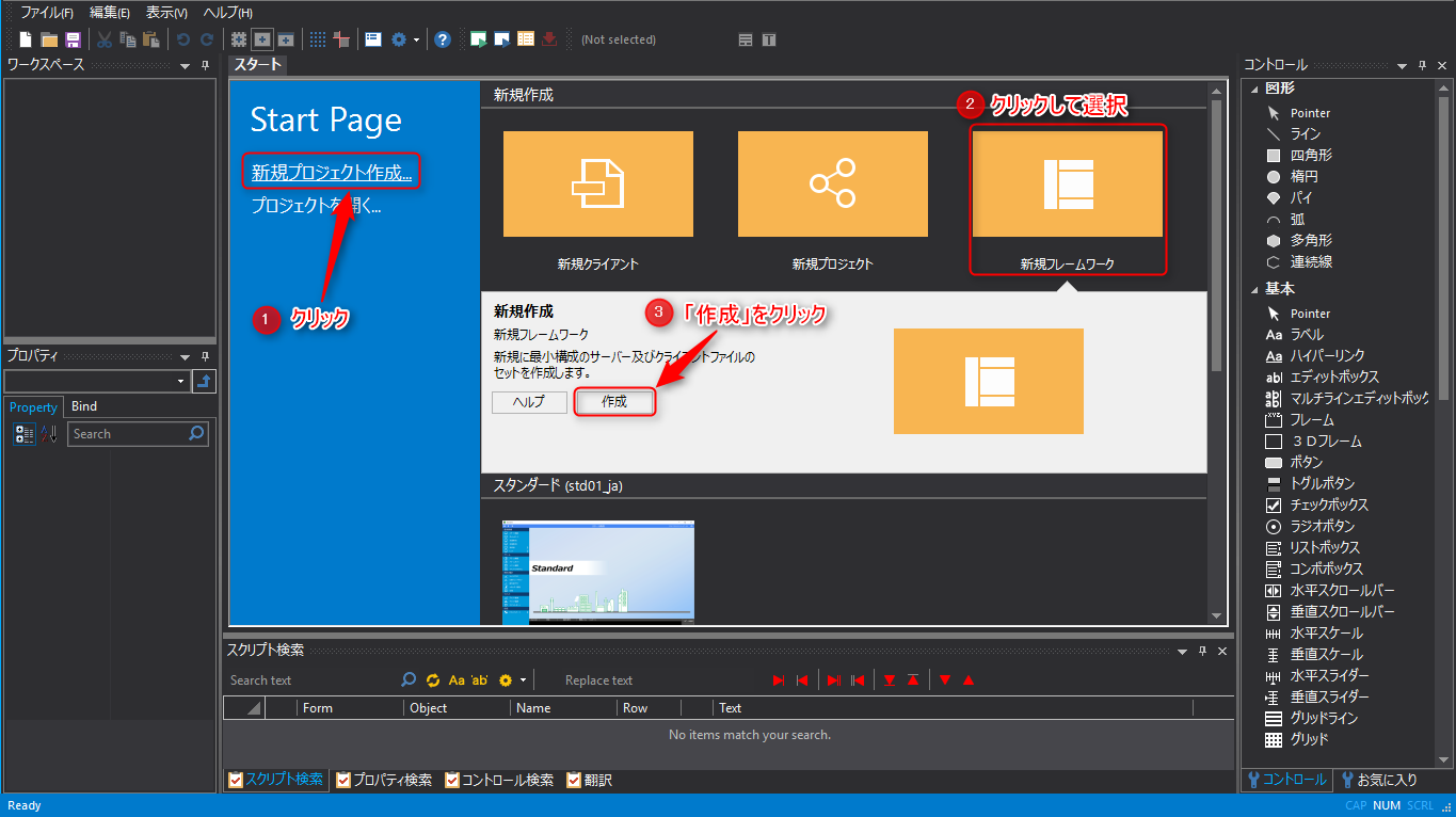 2.Panel Editorを起動し、「新規プロジェクト作成」をクリックします。右エリアに新規プロジェクトのベースとなるフレームワークが表示されるので、「新規フレームワーク」を選択し、「作成」ボタンをクリックします。確認画面が表示されるので、「はい」を選択します。